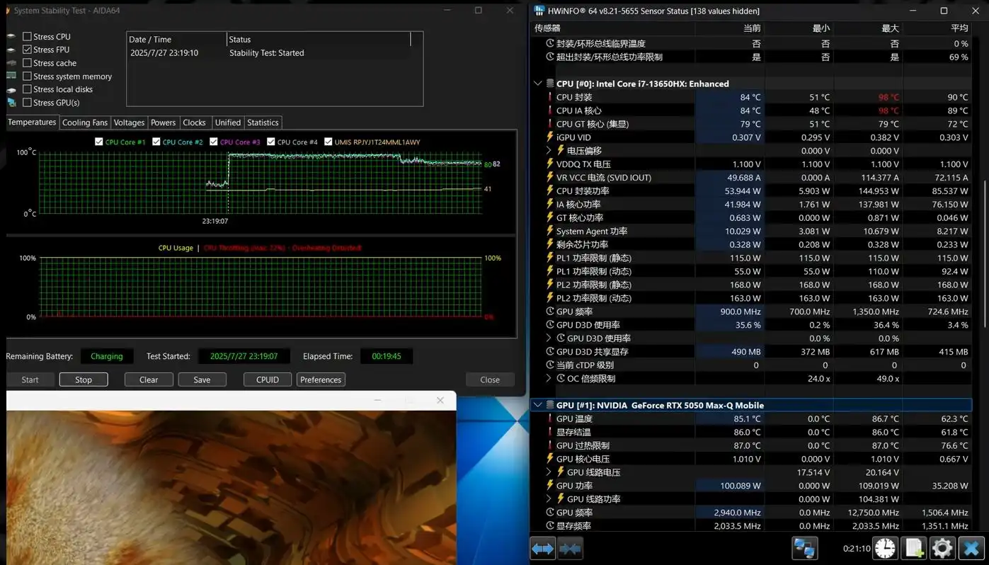 13650HX in performance modes sustains at 96°C@105W. In balance mode the CPU runs slower at 88°C and in quiet mode does it go down to 81°C at much lower clock speeds.