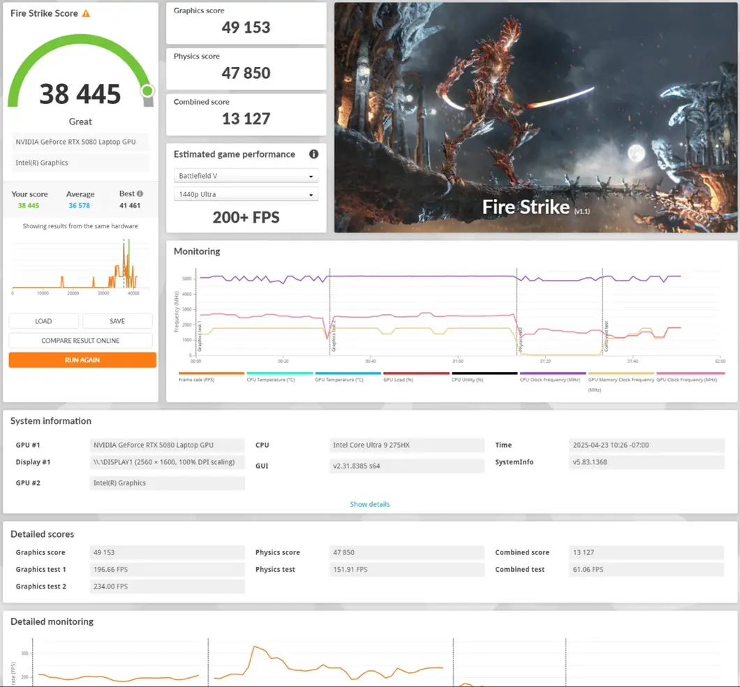 3DMark 13 - Fire Strike: 38210 (Graphics - 48727, Physics - 49078, Combined - 12949);